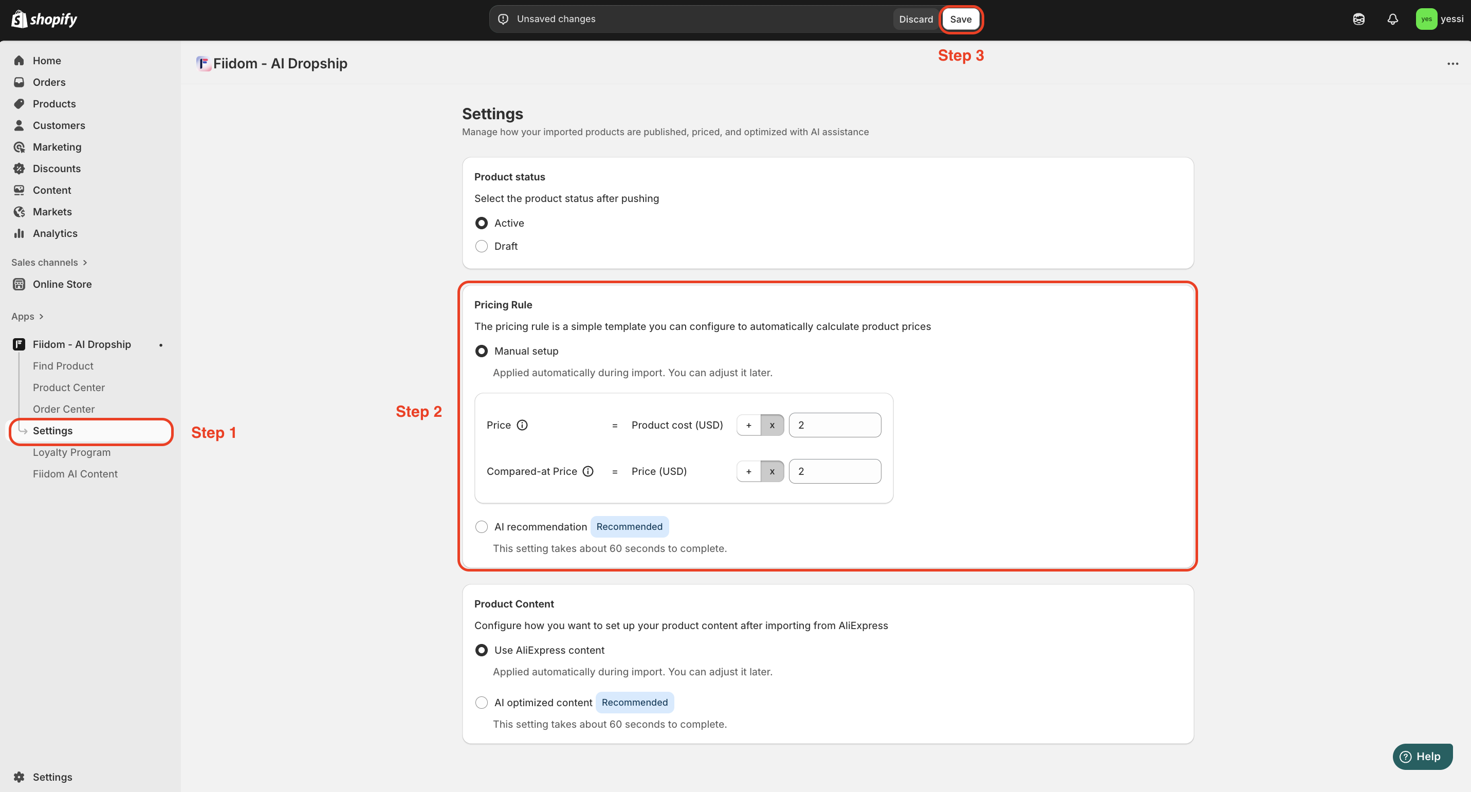 3. In the Pop-up, navigate to the Pricing Rule part. Manual setup is selected by default. You can keep this or select the AI Recommendation option by clicking its radio button to let AI suggest a pricing formula.