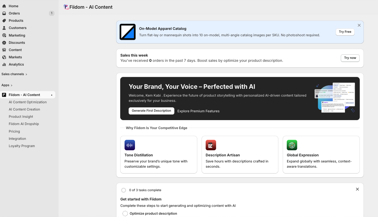 Once installed, the app will appear in your Shopify admin under Apps. Click on “ Fiidom: AI Product Description” to open it.