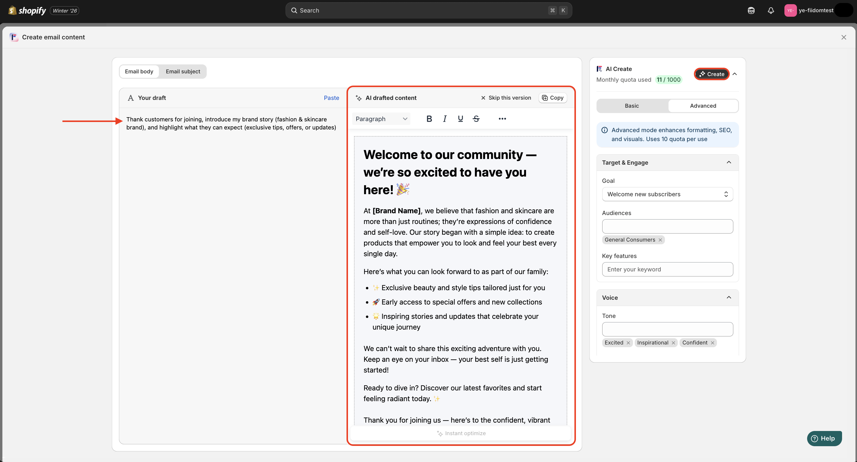 - For the email subject line, paste your draft and choose Basic for quick formatting or Advanced for enhanced SEO and visuals.