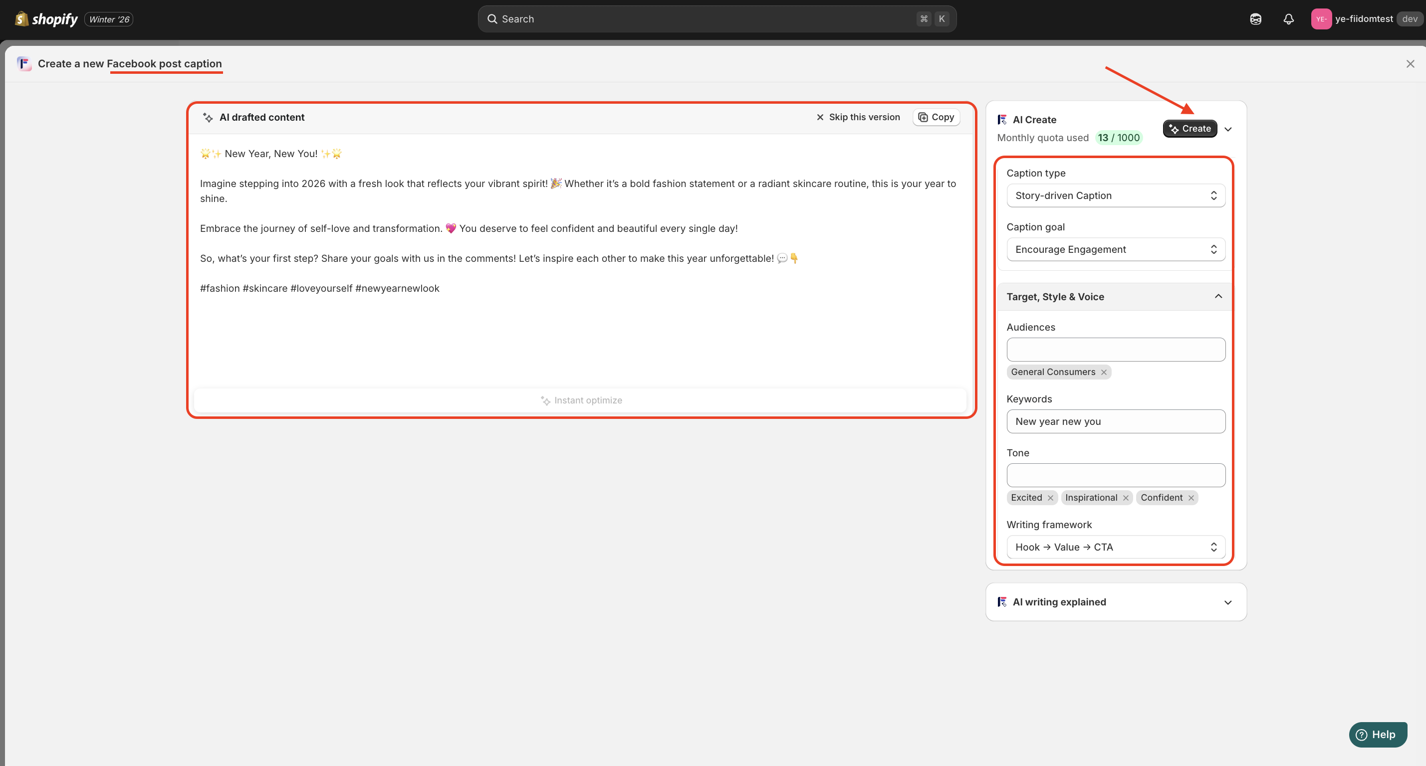 2. Click Social post captions to generate new post captions.