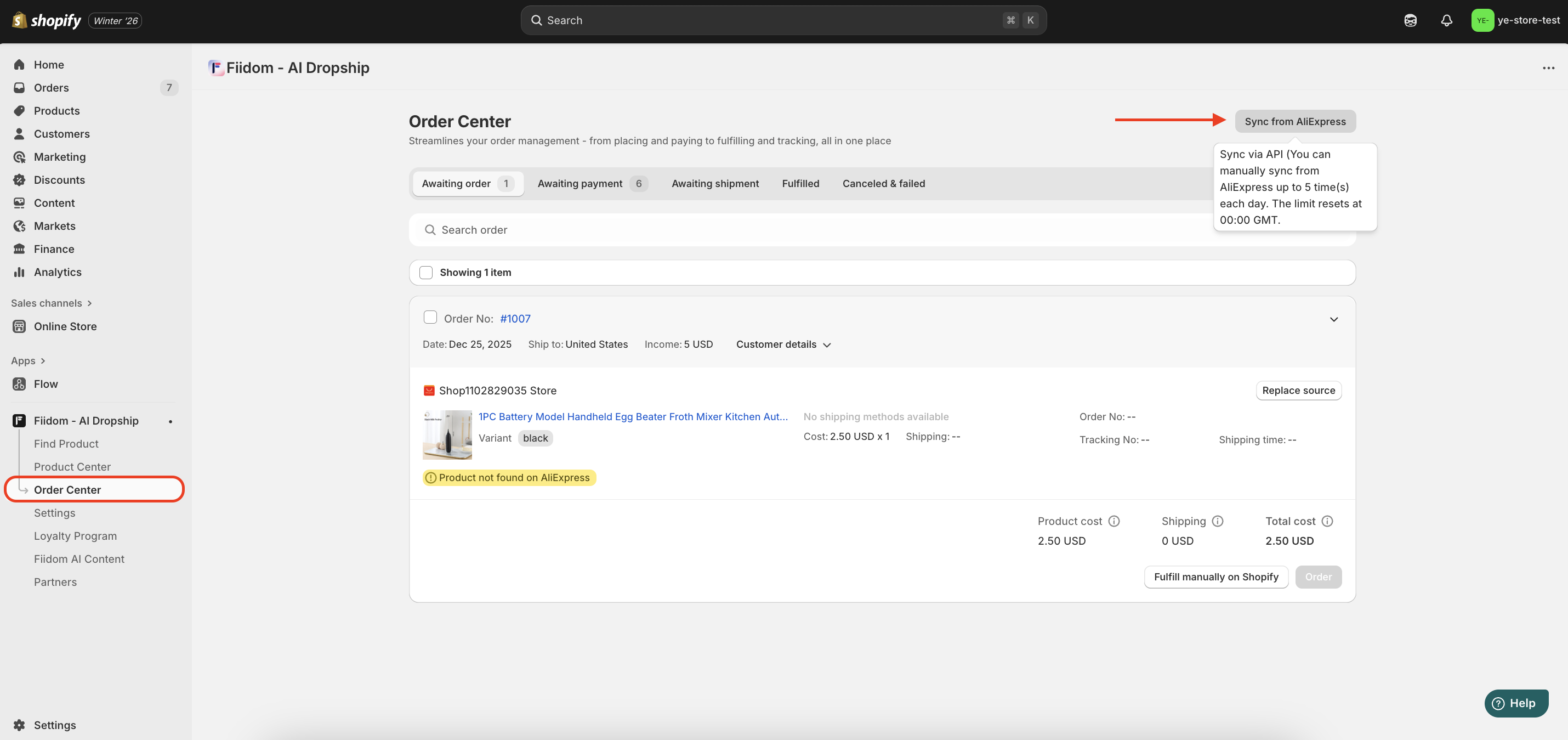 If you need to synchronize the order information more quickly due to an urgent order, follow these steps: Login to Fiidom > Order Center > Click Sync from AliExpress.